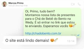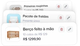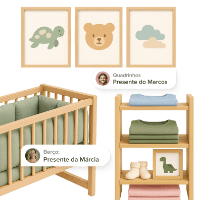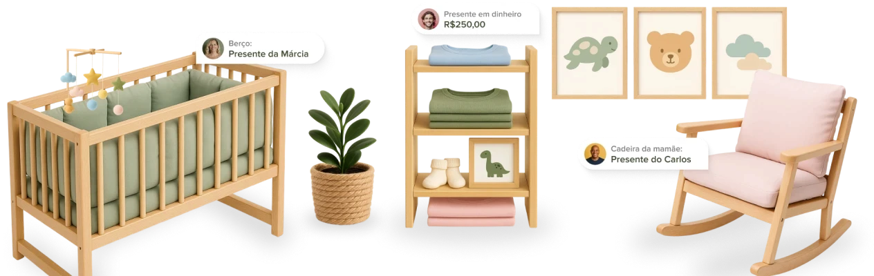 A mesma parceira do seu casamento agora no chá de bebê. Organização, lista em dinheiro e confirmações via WhatsApp, tudo em um só lugar.