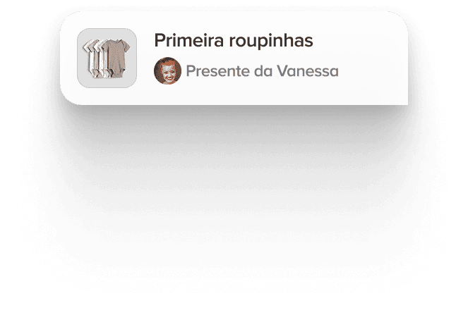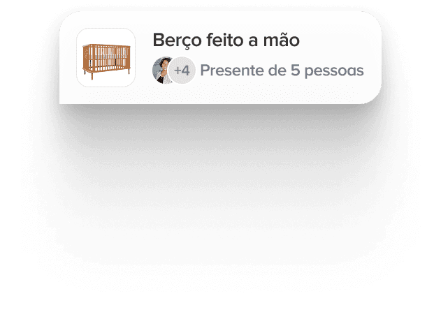 Você monta uma lista com os itens que quiser (fraldas, roupinhas, carrinho, enxoval). Os convidados escolhem o presente e pagam via Pix ou cartão. O dinheiro cai na sua conta — você compra o que quiser, onde quiser.