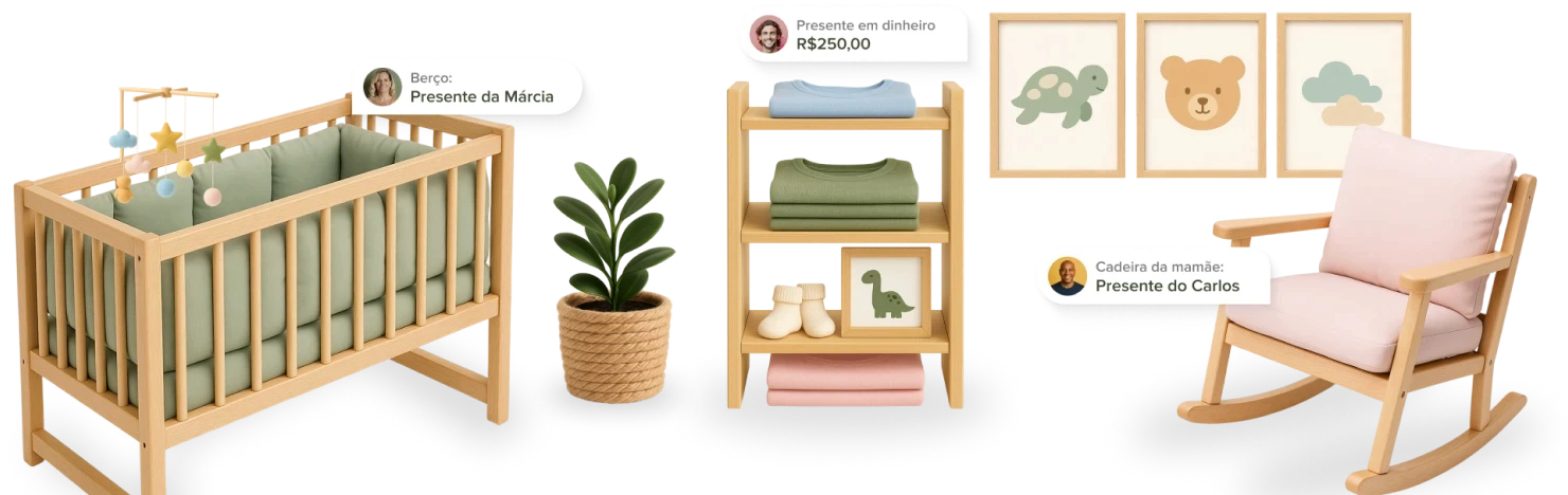 A mesma parceira do seu casamento agora no chá de bebê. Organização, lista em dinheiro e confirmações via WhatsApp, tudo em um só lugar.