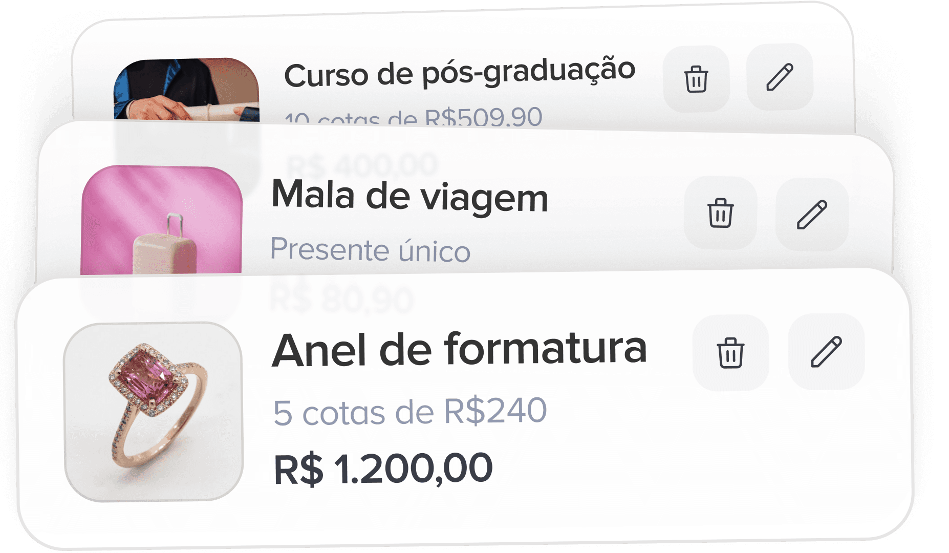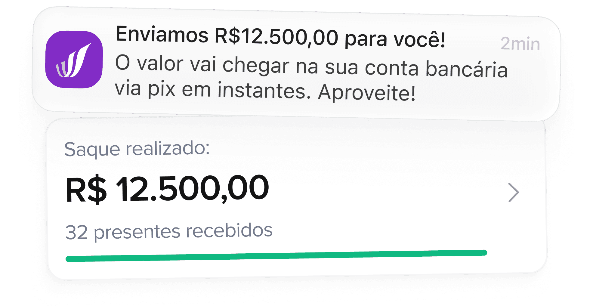 Você cria e personaliza sua Lista de Presentes fictícia e compartilha com seus convidados, os convidados acessam o seu Site e compram o presente, você recebe notificações em tempo real para acompanhar cada detalhe, e a partir de 1 dia útil após o recebimento seus valores estarão disponíveis para saque via PIX.