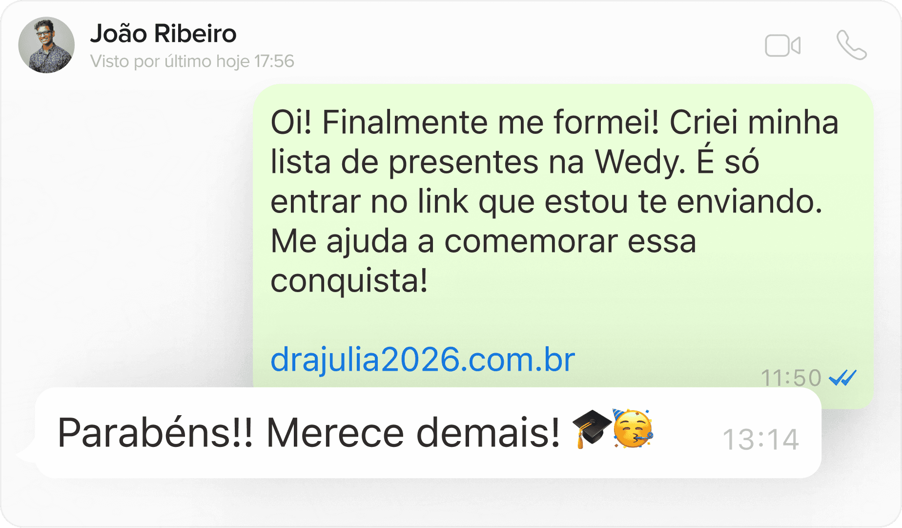 Os convidados recebem uma mensagem automática pelo WhatsApp e confirmam direto por lá. Você acompanha tudo no painel, sem precisar cobrar ninguém.